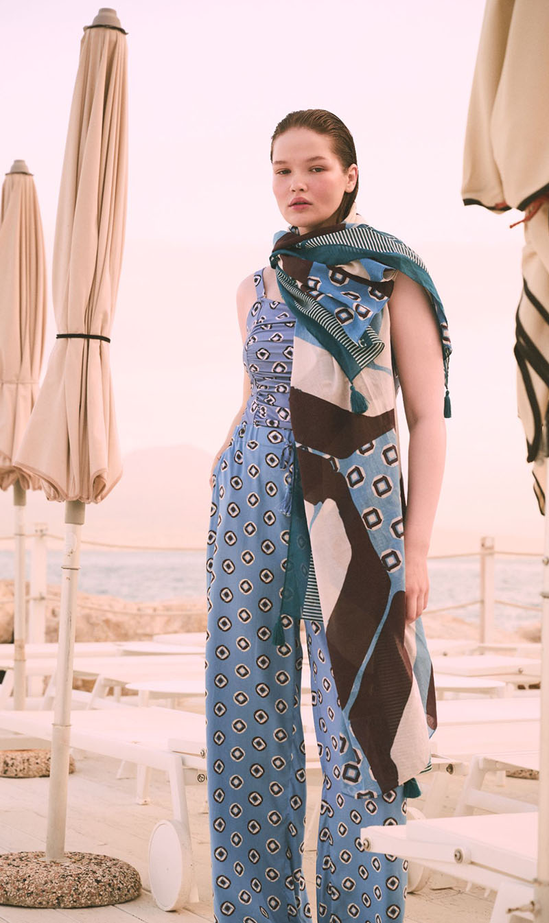 The colour story draws inspiration from the summer firmament, from the delicate whispers of morning hues – as seen in a beautifully printed one-piece swimsusuit – to the vibrant crescendo of sunset shades.